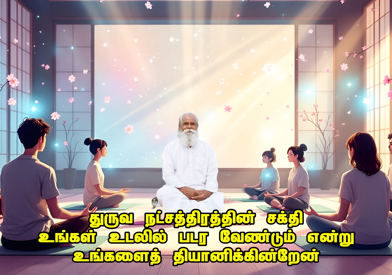 அம்மா அப்பா அருளால் மாமகரிஷி ஈஸ்வராய குருதேவர் அருளால் அகஸ்திய மாமகரிஷிகளின் அருள் சக்தியும் துருவ மகரிஷிகளின் அருள் சக்தியும் துருவ நட்சத்திரத்தின் பேரருளும் பேரொளியும் நாங்கள் பெற அருள்வாய் ஈஸ்வரா என்று உங்கள் உயிரான ஈசனிடம் வேண்டி அதே உணர்வு கொண்டு கண்ணின் நினைவைப் புருவ மத்தியில் எண்ணி உற்றுப் பாருங்கள்… அதை ஏங்கிப் பெறுங்கள்.